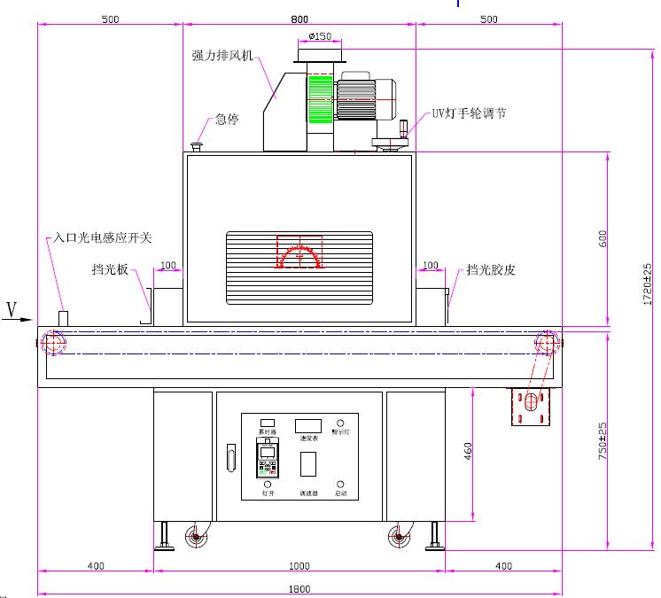 1、UV灯功率:8.0kw*l支 (UV卤素灯) | 2、UV灯总长: 620mm、弧长:500mm |