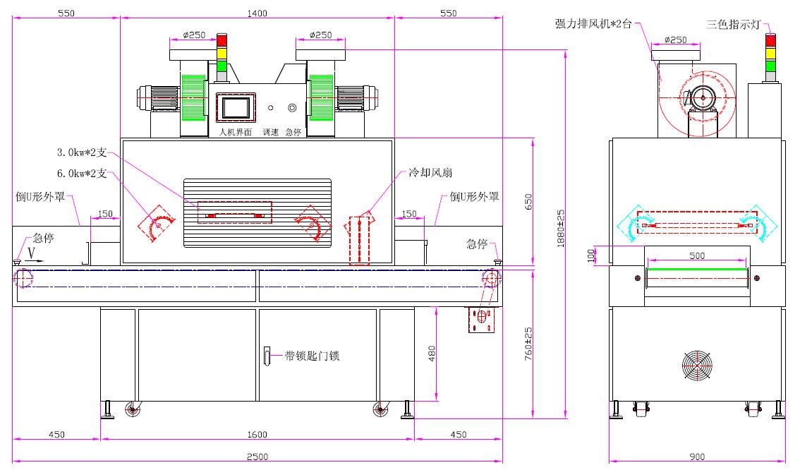 1、UV灯功率:6.0kw*2支、3kw*2支(UV汞灯) | 2、UV灯总长:6.0kw:620mm、3kw:300mm |