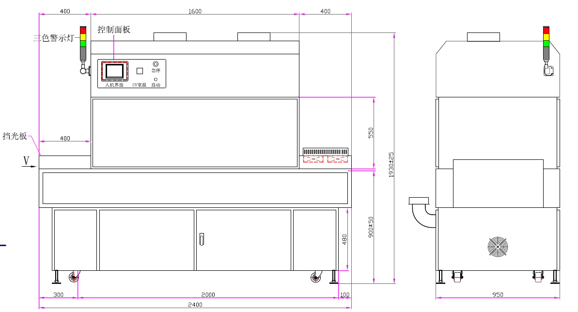 | 3、UV灯功率:3.0kw*2支、6kw*2支(UV汞灯) | 4、UV灯总长:3.0kw:400mm、6kw:620mm |