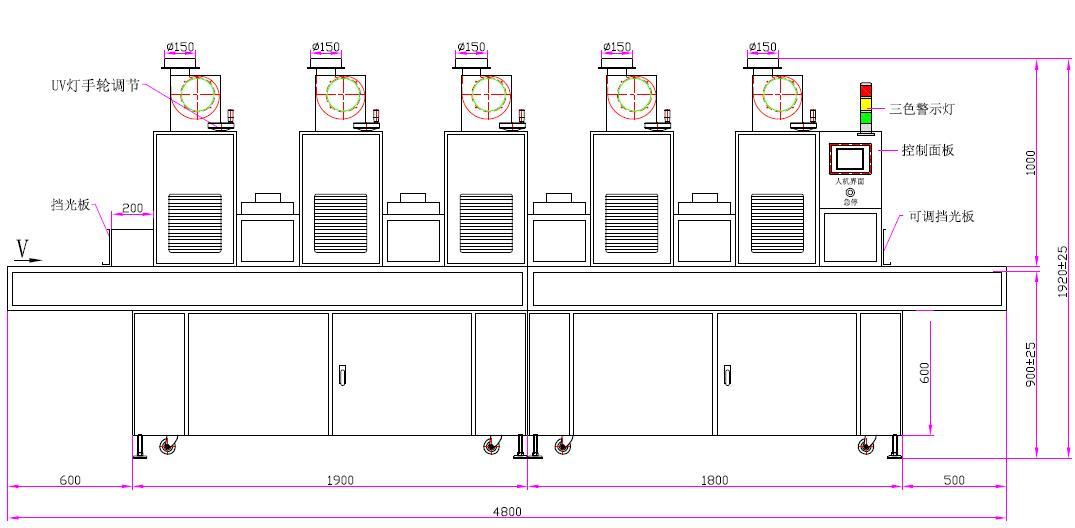 | 1、UV灯功率:6.0kw*5支(卤素灯) | 2、UV灯总长:620mm、弧长:500mm |