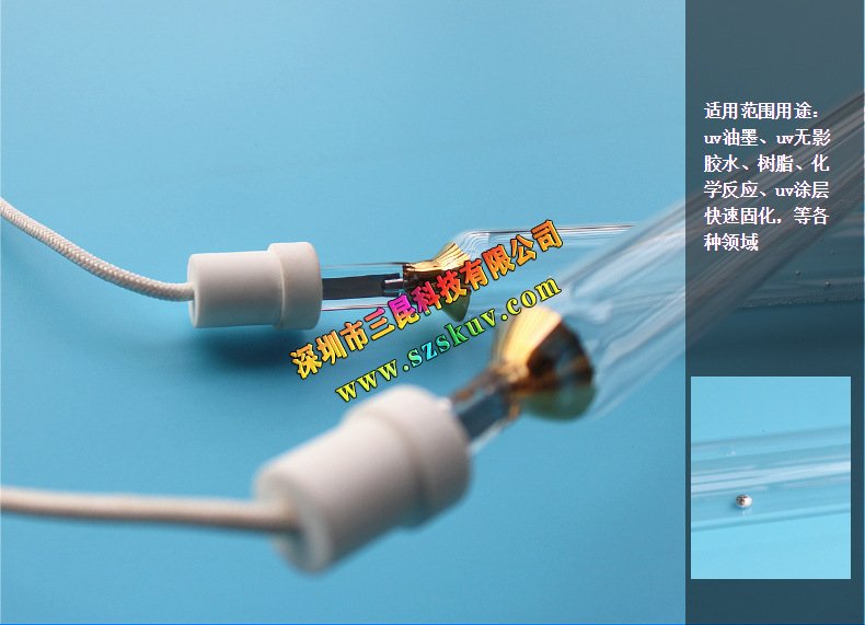 紫外线高压uv灯管属高强度气体放电uv灯,该灯光谱在350nm-450nm之间,主峰值365nm,具有极高的功率密度和有效的紫外线波长,功率有125w-24kw近百种规格。该灯被广泛应用于印刷行业上光、油墨固化、光化学反应、竹木地板、家俱油漆固化、印铁制罐、光盘印刷、玻璃粘接及线路板、半导体、电子行业,紫外线高压汞灯属高强度气体放电灯,该灯光谱在350nm-450nm之间,主峰值365nm,功率有